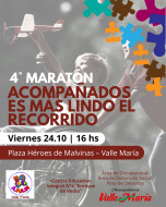 En el marco del Mes de la Inclusión, el próximo viernes 24 de octubre a las 16:00 se realizará la 4ª edición de la Maratón “Acompañados es más lindo el recorrido” en la Plaza Héroes de Malvinas de Valle María.