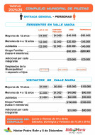 La Municipalidad de Valle María informa a la comunidad y a los visitantes que, a partir del Viernes 5/12, entrarán en vigencia las nuevas tarifas correspondientes al Complejo Balneario Camping y al Complejo Municipal de Piletas.