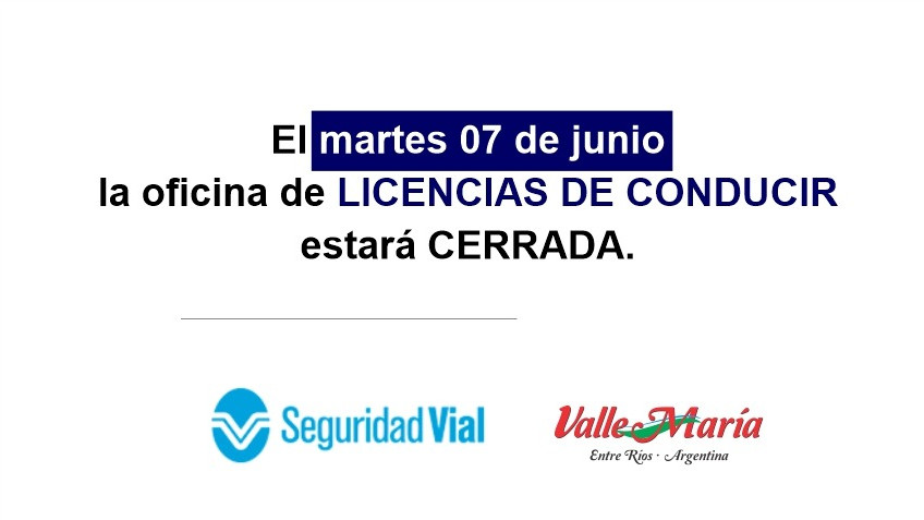 El Centro Emisor de Licencias de Conducir de Valle María informa que el día martes 7 de junio la oficina permanecerá cerrada.