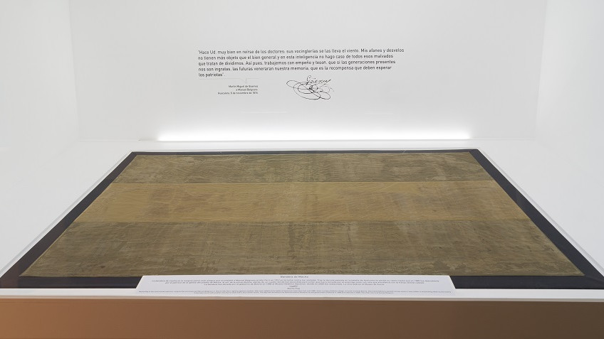 Fue el cura Martín Castro quien las halló. “Al recorrer la capilla, se detuvo frente a unos cuadros de Santa Teresa que descolgó, y al arrancar los marcos se encontró con dos grandes banderas de más de dos metros de largo”, cuenta Viviana Mallol, magíster en Historia del Arte Argentino y Latinoamericano y coordinadora técnica del Museo. Una de ellas, de 2,34 por 1,56 metros, era de seda despulida, con tres franjas horizontales: celeste, blanca y celeste; la otra, de parecido tamaño, pero con distintos colores: roja, celeste y roja. Sin embargo, con el correr tiempo, se demostró que el rojo fue generado por una decoloración de otro material que se encontraba en el cuadro donde estaban guardadas.