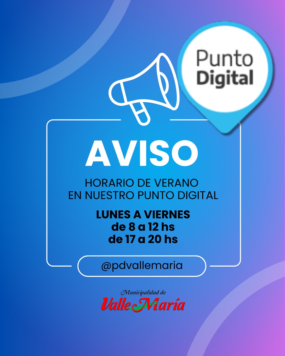 La Municipalidad de Valle María informa que, a partir del viernes 26 de diciembre, el Punto Digital de Valle María implementa su horario de verano.