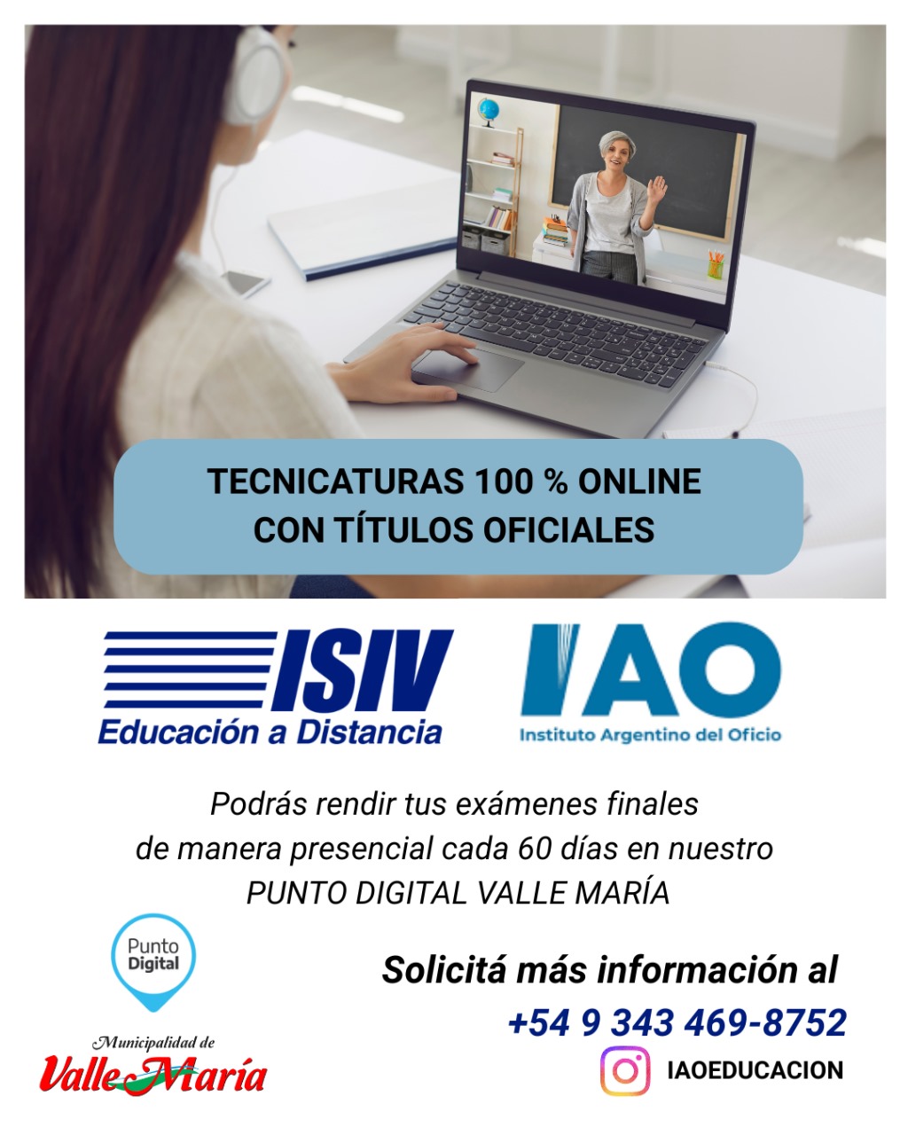 Gracias al convenio vigente entre el Municipio de Valle María y el Instituto Argentino del Oficio (IAO Argentina), nuestra localidad es sede presencial para instancias de rendida bimestral y asesoramiento académico.