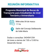 La Municipalidad de Valle María invita a jóvenes estudiantes residentes en Valle María que cursan o comienzan estudios terciarios o universitarios a acercarse a dicha jornada donde se brindará información sobre los distintos detalles de la implementación del programa en 2026.