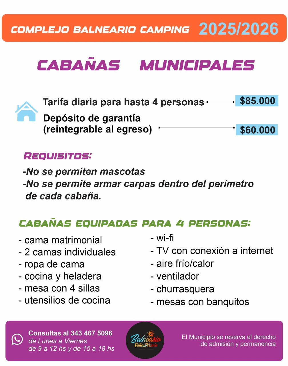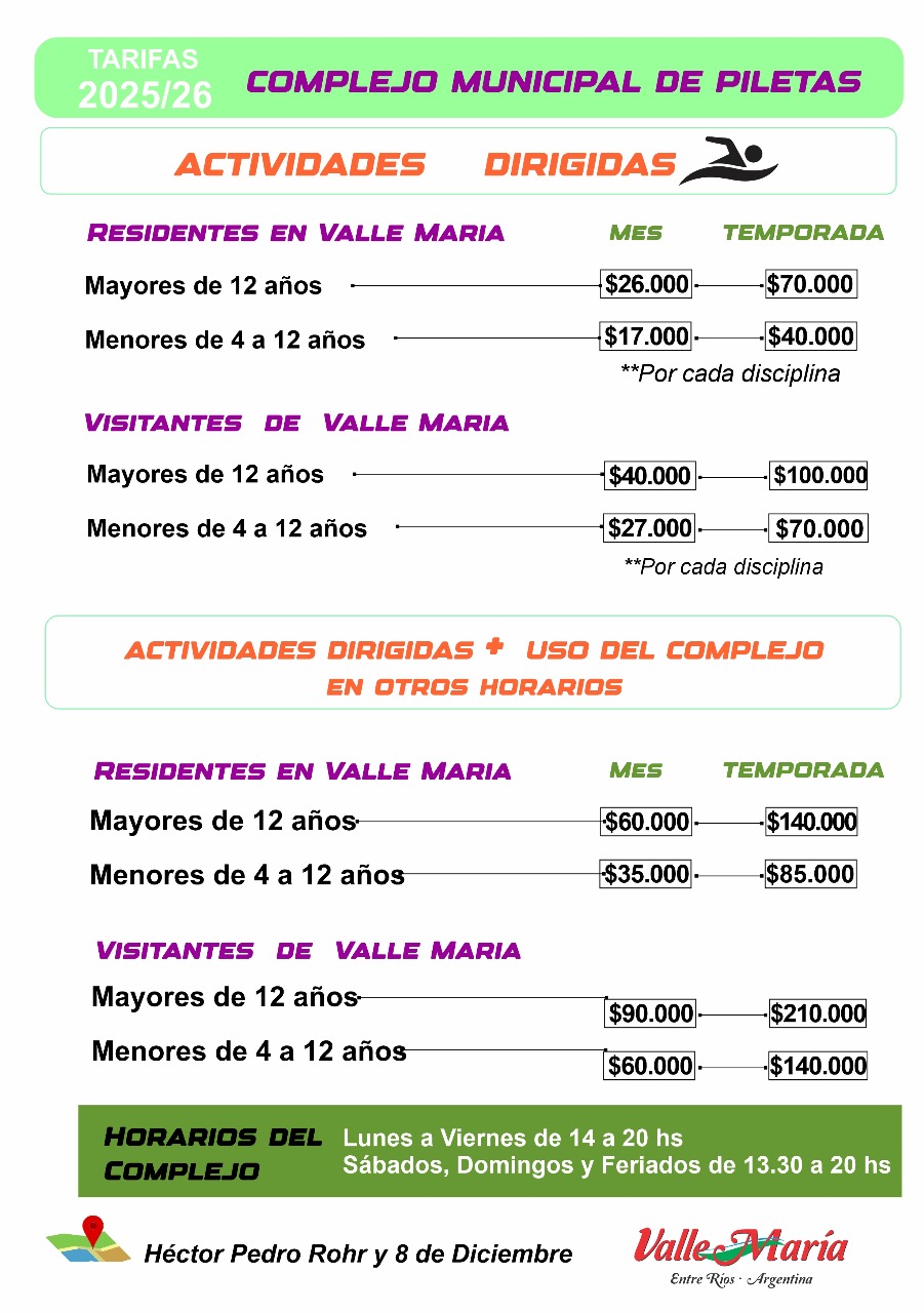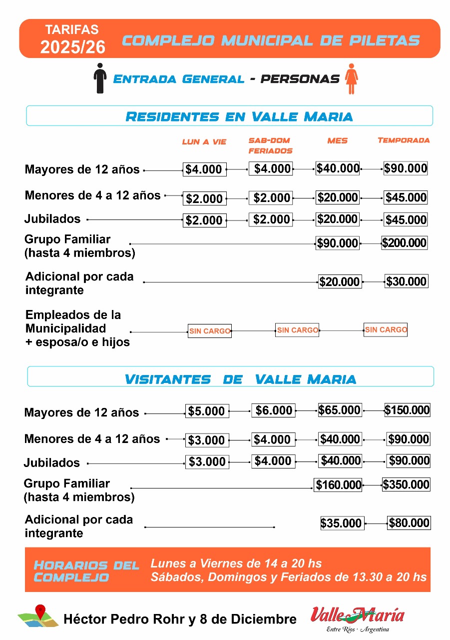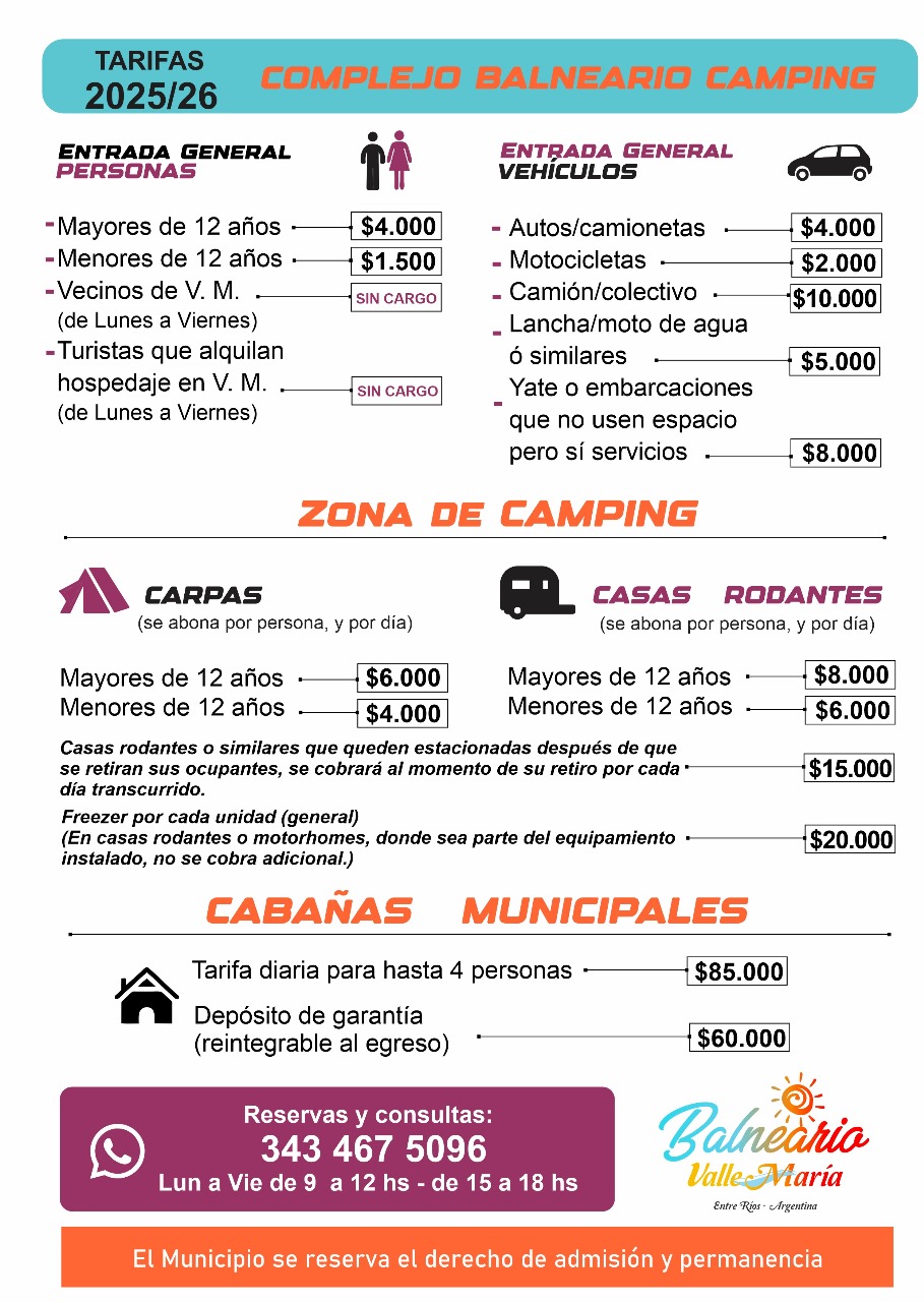 La Municipalidad de Valle María informa las tarifas que se aplican en el Complejo Balneario-Camping y en el Complejo Municipal de Piletas por los servicios brindados en la Temporada 25-26.